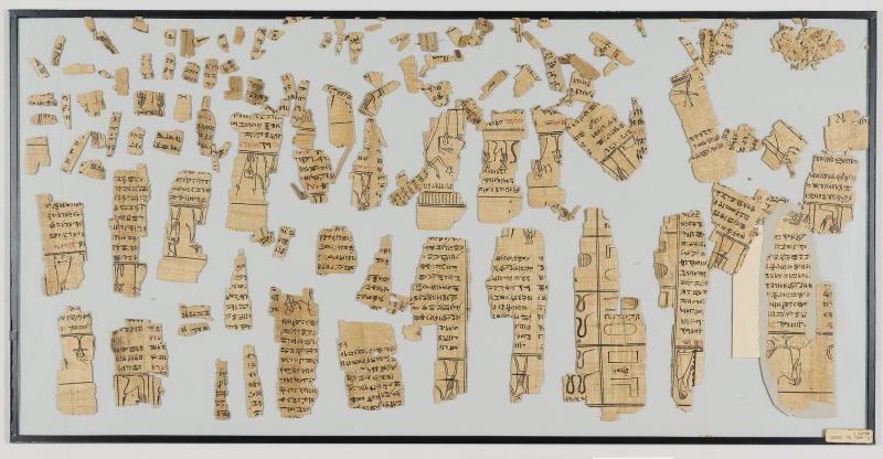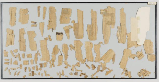 1 pane of glass containing many papyrus fragments ; 8 x 24 inches