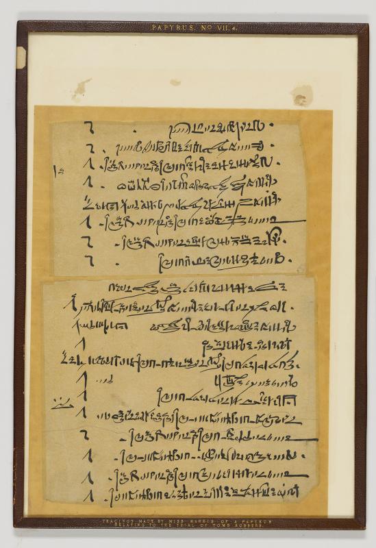 One of 7 original tracings of a papyrus, the last lines of the pages being almost entirely destroyed. Tracings made by Miss Harris ca. 1860. The original papyrus was found at Medinet Habu ca. 1860 and purchased by the Trustees of the British Museum in 1885; it is now in the National Collection.