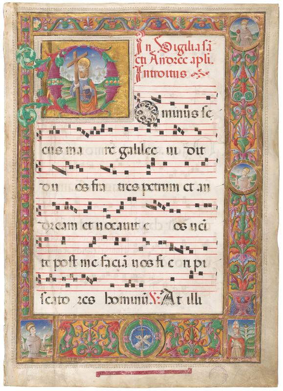 Frontispiece of the Belluno Gradual with an historiated initial "D" opening the Introit Dominus secus mare Galilee for the vigil of the Feast of St. Andrew (29 Nov.), depicting St. Andrew, the first saint celebrated in the Sanctorale. The rubric, in red, reads: "In Digilia sa[n]cti Andree ap[osto]li Introitus." St. Andrew holds a cross in a landscape before a rocky road, the initial is composed of a cornucopia and acanthus terminals against a burnished gold ground. Four half-length Franciscan saints in the full border of Renaissance ornament include: Bernard, Anthony, Bonaventure with the Arbor Crucis and Francis of Assisi receiving the stigmata. At the center of the lower border is a wreath enclosing the emblem of the Franciscan order [two arms crossed, one bleeding from the hand, before a cross]. Below the border is a red banderole inscribed in liquid gold capitals, OPUS: CONVENTUS MINORUM CIVIDALIS BELLONE: LUDOVICUS P[INXIT]. There are 7 lines with musical notation in black on a red four-line stave. The purple ownership stamp of the library of the princes of Stolberg-Wernigerode appears at the bottom right. Musical notation appears on the reverse.