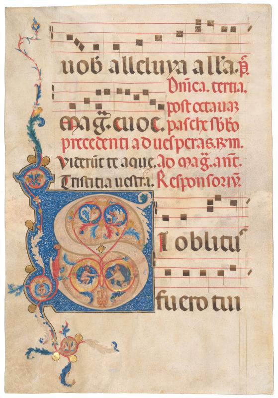 Large historiated initial "S" (of Si [If]), beginning the first Matins response for the first lesson for the Divine Office for the fourth Sunday after Easter.