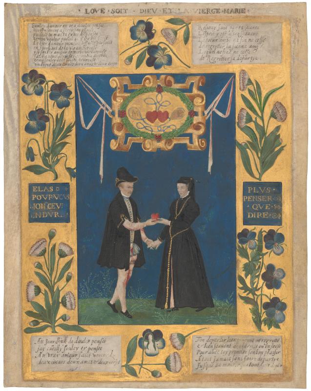 This French Renaissance leaf with apparently unique verses is a rare survival of an independent illumination made as a lover's gift. Its portraits are direct antecedents of the independent portrait miniature.