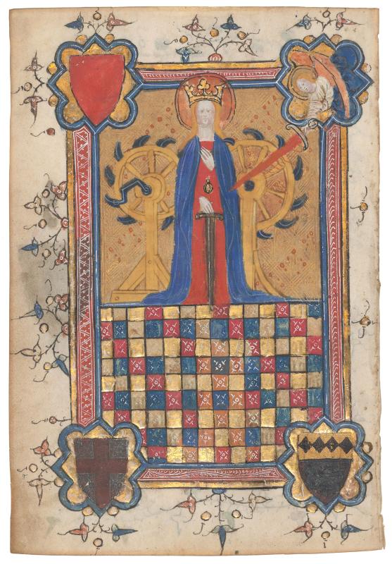 Thirty-one sisters miniatures to the present leaf are dispersed, some traced, others whereabouts unknown: St. Bartholomew (London, Sotheby's, 9 February 1948, lot 215; bought by Eiseman [£16]; Elizabeth M. Drey, New York [exhibited at the Montreal Museum, 1965]; Paul Drey Gallery, New York [exhibited at the University Art Gallery, Binghampton, 1968]; Sir John Pope-Hennessy [1913-1994]; his sale, New York, Christie's, 10 January 1996, lot 4; bought by Sam Fogg; acquired by Robert McCarthy, London, 1996 [his BM 1055; Kidd, McCarthy Collection, II, 18a]); All Saints (London, Christie's, 25 June 1997, lot 3; acquired by Robert McCarthy, London, his BM 1106, exhibited at the J. Paul Getty Museum, 2014-2015; Kidd, McCarthy Collection, II, 18b); St. Saturninus (bought from Rudolf Wien by Eric Korner [his no. 20], 1952 [along with St. George]; his first sale, London, Sotheby's, 19 June 1990, lot 32; bought from the buyer by Bernard H. Breslauer [1918-2004], Voelkle and Wieck, Breslauer Collection of Manuscript Illuminations, 1992, no. 17; Sam Fogg; acquired by Robert McCarthy, London, 2003 [his BM 1434; Kidd, McCarthy Collection, II, 18c]); St. Christopher (London, Sotheby's, 18 June 2002, lot 20; London, Sotheby's, 2 July 2013, lot 29; acquired by Robert McCarthy, London [his BM 2413, exhibited at the J. Paul Getty Museum, 2014-2015; Kidd, McCarthy Collection, II, 18d); St. Helena (1 of the 5 leaves re-acquired from Wien by H.P. Kraus, Catalogue 80, 1956, no. 16c); St. Stephen (Bruce Ferrini, 1993); St. Margaret (London, Sotheby's, 9 February 1948, lot 216); a text leaf, St. Andrew, and St. Martin (the last previously owned by John Howell Books, San Francisco; all three now Los Angeles County Museum of Art, M.74.100.1-3); St. Matthew (?) and St. James the Greater (Sarasota, John and Mabel Ringling Museum, nos. 730, 731); St. Nicholas (1 of 5 leaves re-acquired from Wien by Kraus, Cat. 80, 1956, no. 16a, illus.; London, Sotheby's, 21 June 1994, lot 25, illus.; Sam Fogg; Bruce Ferrini, Catalogue 3, 1995, no. 18, illus.; Denver Art Museum, Berger Collection Educational Trust, TL-18663; London Sotheby's, 23 May 2017, lot 18, illus.); St. Barnabas (Ferrini, Catalogue 3, 1995, no. 19; Denver Art Museum, Berger Collection Educational Trust; London, Sotheby's, 23 May 2017, lot 19, illus.); St. George (bought from Wien by Eric Korner in 1952 [along with St. Saturninus]; his second sale, London, Sotheby's, 7 July 2009, lot 107, illus.; Sam Fogg; acquired by Robert McCarthy, London [his BM 1968]); St. Lazarus and St. Edmund (2 of 5 leaves re-acquired from Wien by Kraus, Cat. 80, 1956, nos. 16d & e; both New York, private collection); St. Thomas (1 of 5 leaves re-acquired from Wien by Kraus, Cat. 80, 1956, no. 16b; Bruce Ferrini; New York, second private collection).