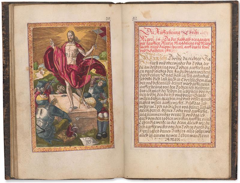This prayer book in the form of a hybrid manuscript includes the complete set of sixteen engravings from Albrecht Dürer's Engraved Passion, with an additional engraving serving as a frontispiece (Dürer's Virgin and Child Seated by a Tree, 1513) -- all hand colored and heightened in with gold and silver. The codex belongs to a small group of manuscript prayer books incorporating hand-colored prints, made in Nuremberg and Augsburg in the late sixteenth century. It can be attributed to Hieronymus Oertel based on comparisons with his signed and dated works.