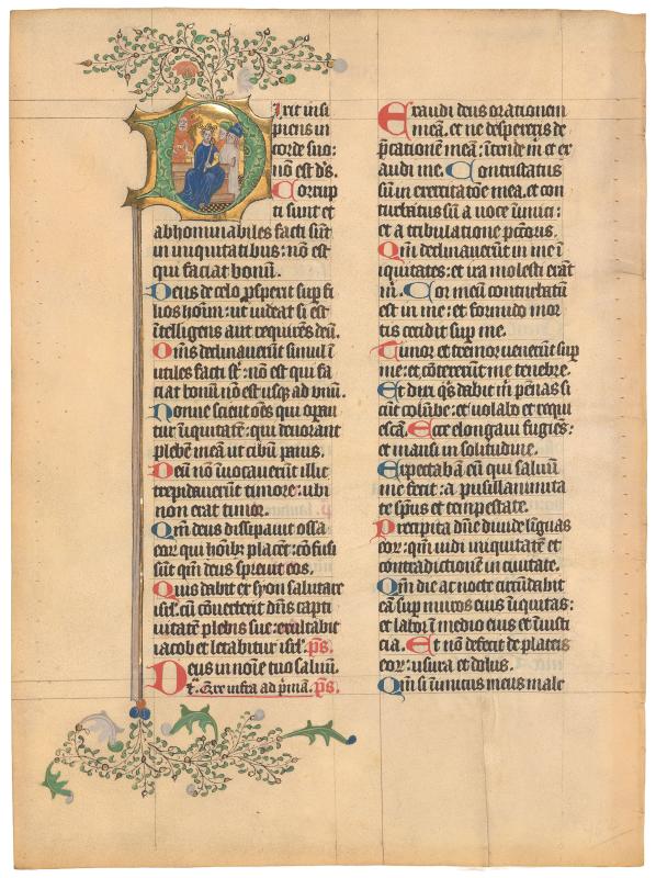 Decoration: historiated initial "D" containing an image of David and the fool.