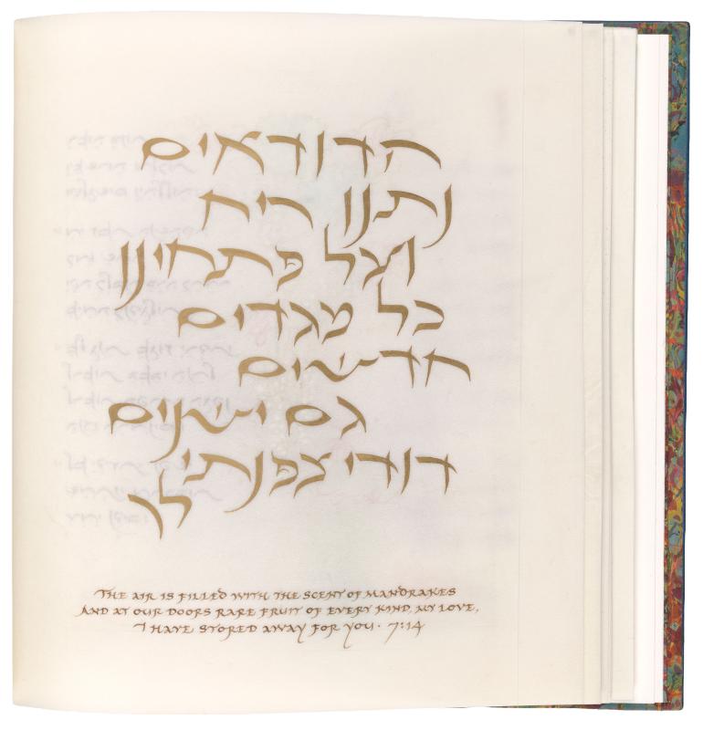 The English text is that of Song of Songs: A New Translation, by Ariel Bloch and Chana Bloch (1995). The illuminated spice boxes accompanying the English translation represent similar pieces from the collection of Joanna S. Rose, as stated in the colophon on fol. 25v.