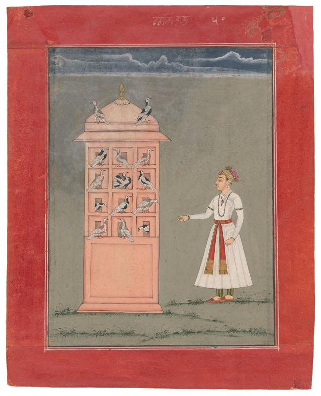The leaf possibly comes from a Rāgamālā, or "Garland of ragas." The Indian ragas are six musical modes, personified by male Ragas, each of whom has five wives or raginis. The dovecot appears to be an attribute of Kuntala Raga, son of Dipak Raga. For other Rāgamālā images in The Morgan Library & Museum, see MS M.211 (36 images), MS M.995, MS M.997, MS M.1009, MS M.1012, MS M.1016, MS M.1035.5, MS M.1041.2, MS M.1048.3, MS M.1049.1-3, MS M.1059.2, MS M.1075.1, MS M.1075.4-5, and MS M.1060.2.