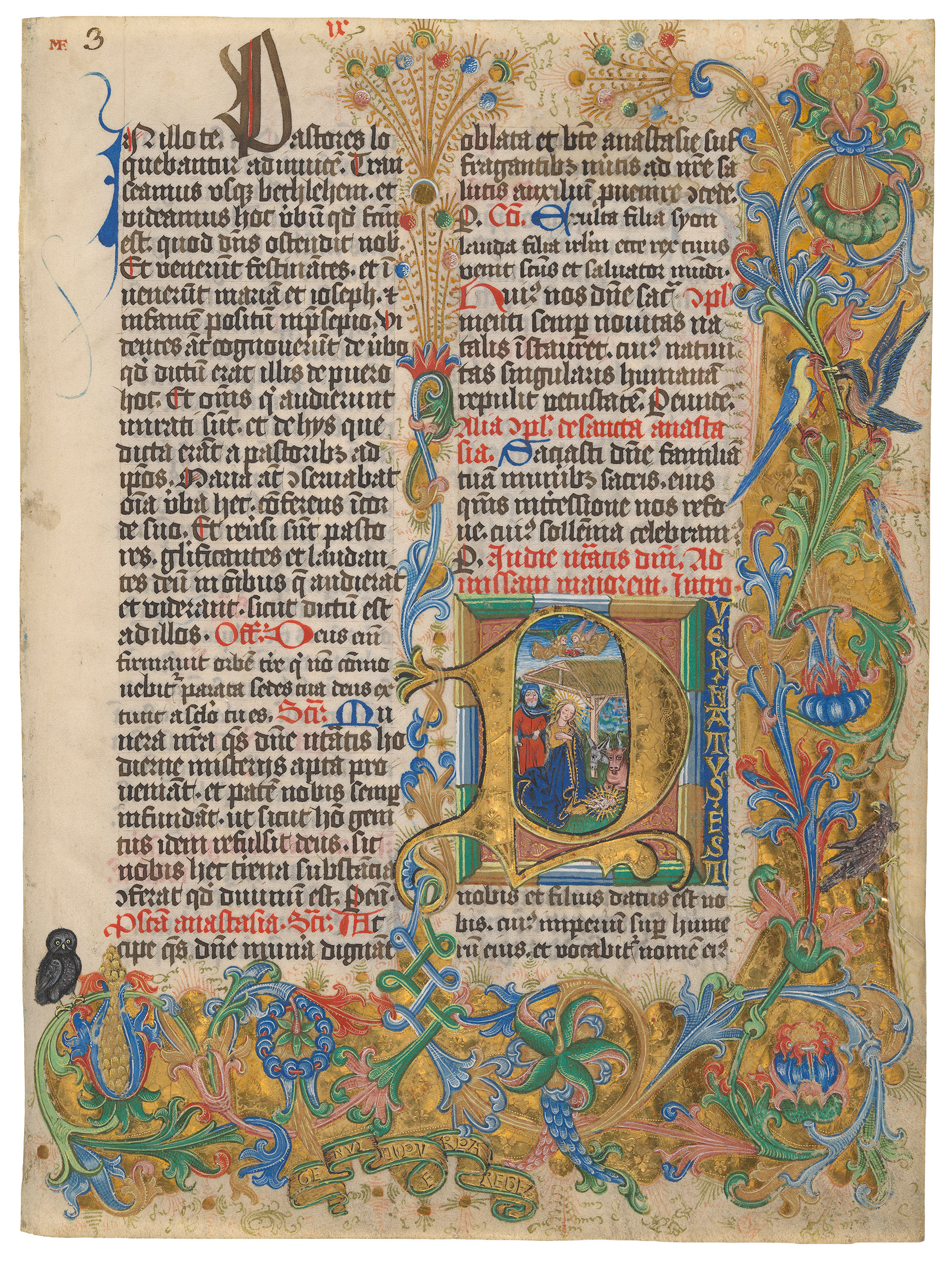 Decoration: Large eleven-line historiated initial P (for Puer natus est), enclosing a depiction of the Nativity, set against a painted panel framed in alternating segments of green, blue, and gold. An elaborate decorative border fills the outer and lower margins as well as between the text columns. The border features highly burnished and delicately tooled gold, brightly painted foliage, and five birds (including an owl and a hawk). At bottom center a painted inscription GENUIT PUERP[ER]A REGEM ("The mother birthed a king"). Alternating initials in blue and red ink.