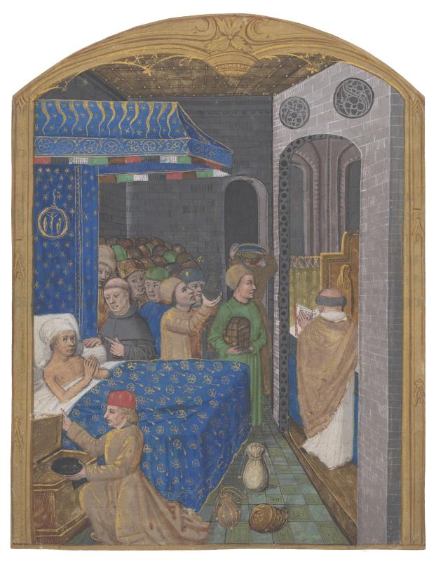Decoration: The miniature (illustrating the text's eleventh peril: being justly deserted by God and the world) depicts a sick man on his deathbed, with hands clasped as if in prayer, watching a priest who reads from a missal at an altar. In the background is a large crowd of laymen, perhaps all physicians to judge by their headgear, including one holding up a specimen-flask to examine its contents, another with a strong-box held under his arm, and a black-clad monk or friar addressing the sick man. In the foreground a man kneels and takes items out of an open chest.