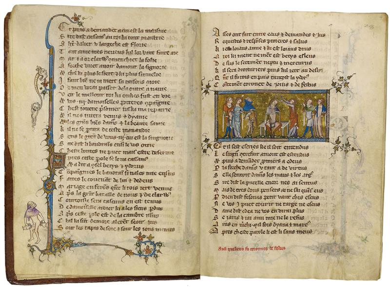 Decoration: 22 miniatures, numerous illuminated initials with marginal extenders, and marginal figures (pen drawings with color washes).