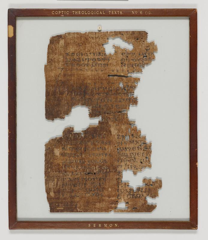 Manuscript fragments from two leaves of a papyrus codex, a homiletic miscellany; written in Egypt.