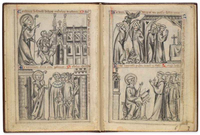 Decoration: 21 full-page miniatures in grisaille (out of a possible 120 miniatures), picturing 42 episodes in the life of Benedict.