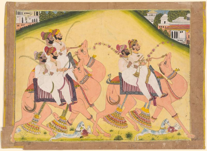 Raja Nerjan Singh, Fatḥ Singh, and companions riding camels.