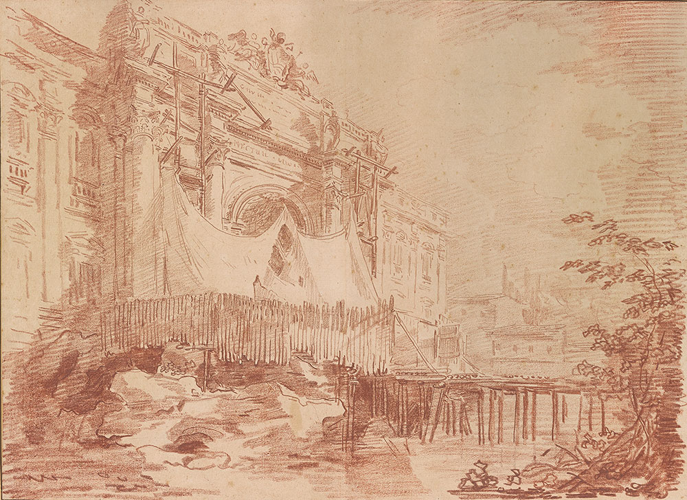 Hubert Robert, The South Façade of the Palazzo Poli with the Trevi Fountain under Construction, ca. 1860–61, red chalk, 323 x 447 mm. Gift of Mrs. Allerton Cushman in honor of Janos Scholz and the Fiftieth Anniversary of the Library, 1973.51.