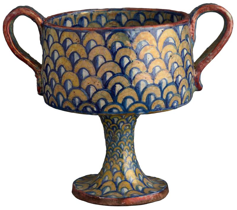 This stemmed cup bears the scale ornamentation characteristic of pottery from Deruta, a town in the central Italian region of Umbria, famous for its production of majolica from the Renaissance to the present. The light-colored earthenware is covered with opaque lead glaze, here set off by brilliant copper luster borders. Inside the cup, the artist has painted Greek deities of fertility, Artemis, Demeter, and Triptolemus, with their serpent attendants, a delightful surprise awaiting the user when the contents of the cup were drained.