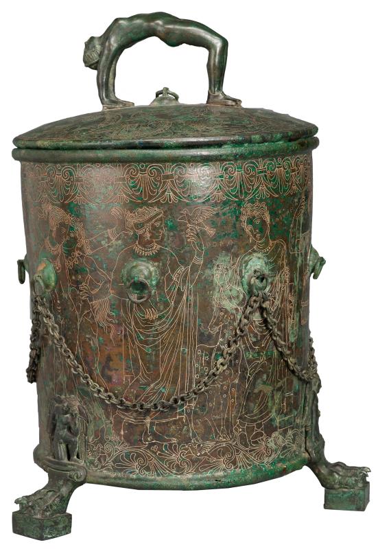 3-foot Etruscan cista with cover. The feet are in the form of a bird's paw. The handle of the cover is in the form of a female acrobat. Tiny ring on top of lid. The box has a chain looped around it. The decorative engravings on the cista represent figures, some of which are identified by engraved names suggesting a connection with the events of the Trojan War.