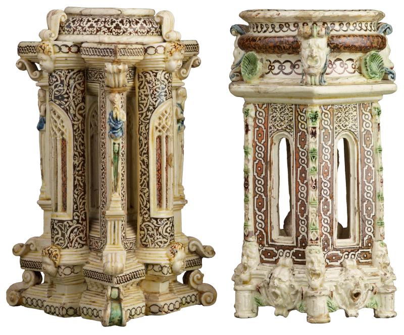 These elaborate salt cellars, intended for an elegant tabletop, are a rare example of the extremely fine complex ceramics produced during the mid-16th century in France. They may have been made at Saint-Porchaire, a town in the southwest, or in a Paris workshop. Only about 60 known examples of this type survive. One cellar is decorated with salamanders, the emblem of the French King Francis I. The other is adorned with interlaced crescents, the insignia of Diane de Poitiers, a noble courtier and consort of Henry II.