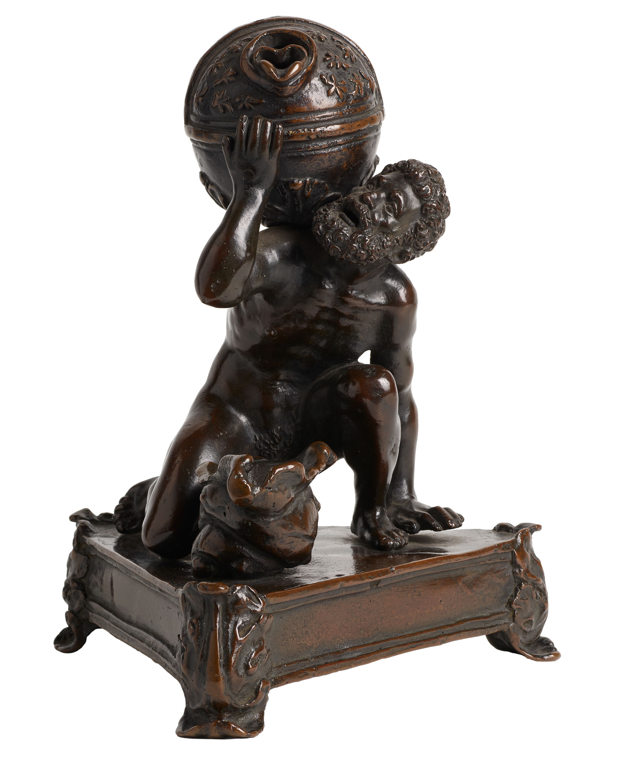 Atlas supporting the globe on his shoulder, crouched on a triangular base with a shell.