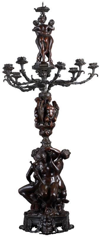 Candelabrum for nine candles. At the base of the candelabrum appear Juno, Minerva, and Venus; at the center, three chimeras; and at the top, the Three Graces.