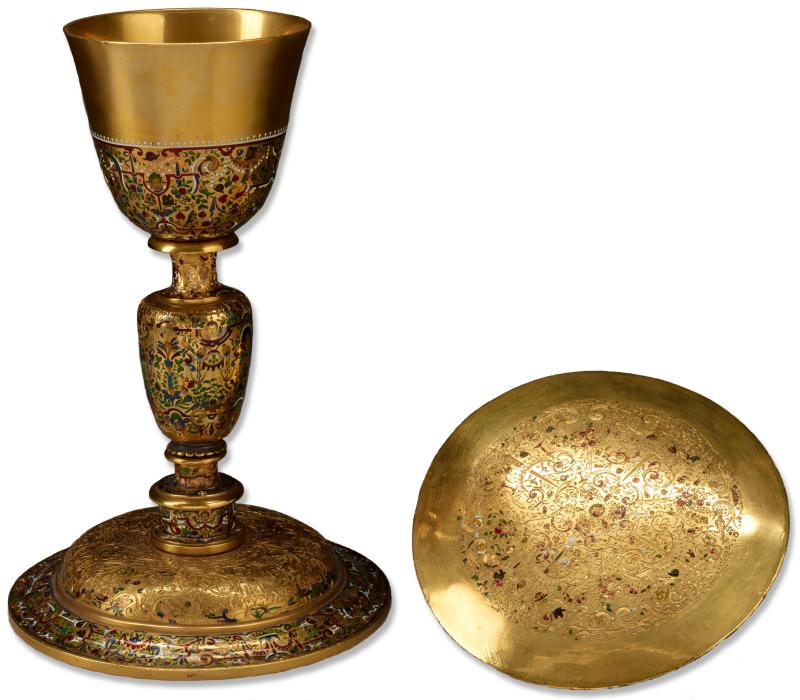 chalice: height: 9 inches (230 mm); base: 6 inches (153 mm) diameter; paten: height: 5/8 inches (15 mm); 5 3/4 x 5 7/8 inches (145 x 150 mm) diameter