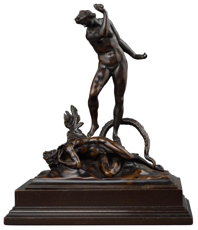 Written in ink on a paper label affixed to the bottom of the base, "Bronze group by Benvento Celini 'Virtue Triumphing over Vice'.