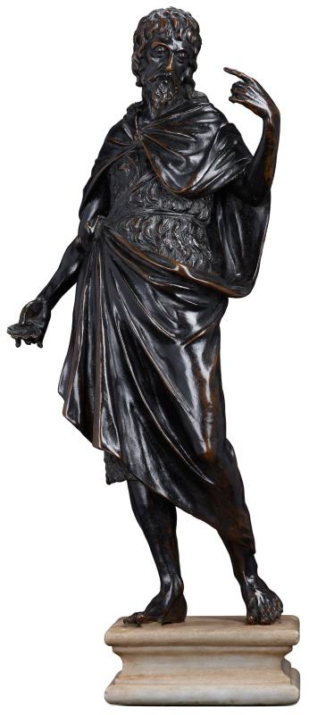 St. John the Baptist, clad in an animal skin and cloak, holds a shell in his right hand. This refers to his role baptizing Christ. He used the shell to gather water in the River Jordan. This sculpture is one of at least five known variants of this figure cast in bronze, some with gilding. It's likely that these figures were based on the earlier fifteenth-century work of the sculptors, Michelozzo and Donatello. They were cast later, however, at the very end of the 16th or beginning of the 17th centuries. Given the baptismal theme, it is possible that the figure was once part of a fountain. This sculpture was given to the Morgan in 1996 as part of the bequest of Alice Tully, a renowned New York opera singer and arts philanthropist.