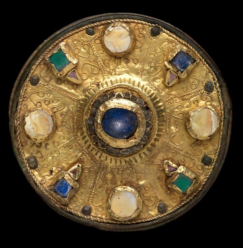 Copper alloy, cement, gold, garnet, glass, mother-of-pearl, iron