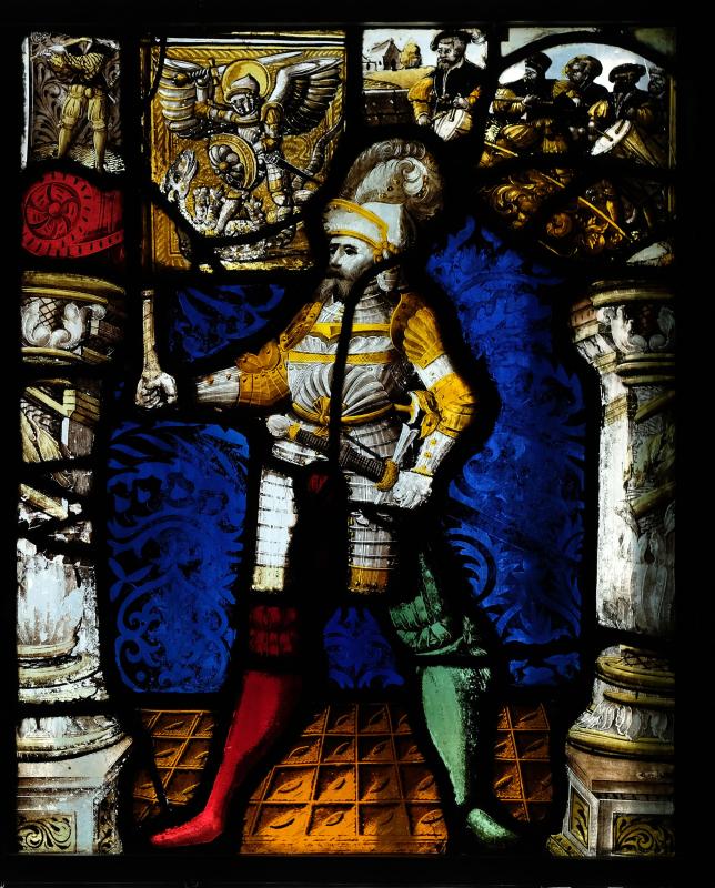 The banner carrier is clothed in half armor with one leg in red and one leg in green hose. He is turned to the left and with his right hand he holds a banner with the image of St. Michael slaying the dragon. This is the device of the Abbey of Beromünster as well as the town. He grasps his sword with his left hand. The banner carrier is silhouetted against a blue damascene backdrop and stands on an ochre floor with a grid pattern. To the left and right are sculpted white columns resting on rectangular bases. At the top of the panel are scenes of men playing in a marching band. The representation of a soldier in armor holding the city's banner was a common element of heraldic representation in Switzerland. The man, by the mid sixteenth century, is often silhouetted against colorful neutral backdrops, not a realistic landscape or interior.