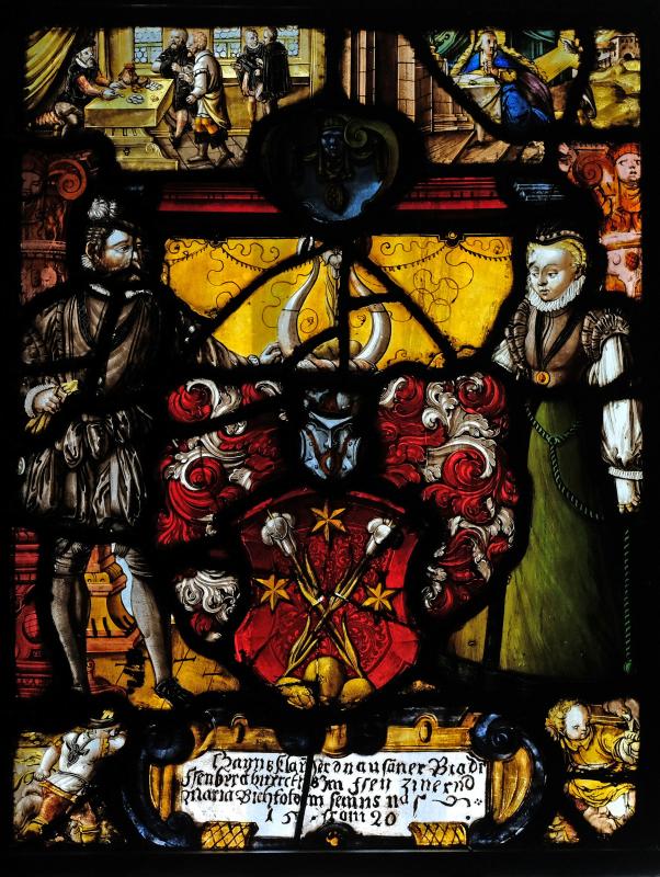 The husband and wife stand on either side of an elaborate coat of arms. The deep red of the shield and mantling is silhouetted against the string-decorated gold ground above. To the left is the husband, wearing a light brown jacket and grey slashed breeches and grey stockings. He holds a pair of yellow gloves in this right hand. On the right, his wife is dressed in a light brown bodice with short puffed sleeves over a white long-sleeved blouse. Her left arm rests on the cord dangling across a long green skirt. Husband and wife stand in front of columns supporting a flat lintel. Above, on the left is a scene of men in a counting house with bull's-eye windows. To the right is an image (stopgap) of the Virgin Mary at prayer, a segment from an Annunciation. The bottom of the panel holds a cartouche with an inscription flanked by putti.
