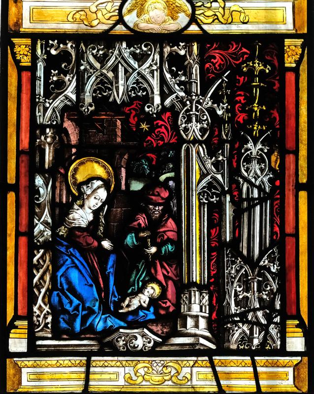 Red, blue, green, and yellow pot metal and uncolored glass, with vitreous paint and silver stain.