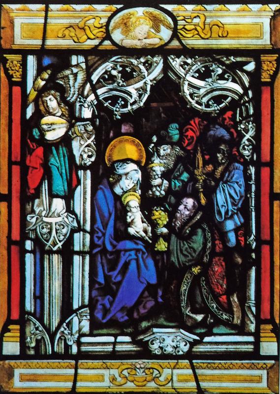 Red, blue, turquoise, green, violet, and yellow pot metal and uncolored glass, with vitreous paint and silver stain.