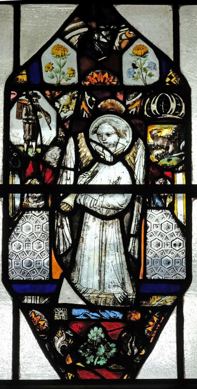 Uncolored glass with vitreous paint and silver stain.