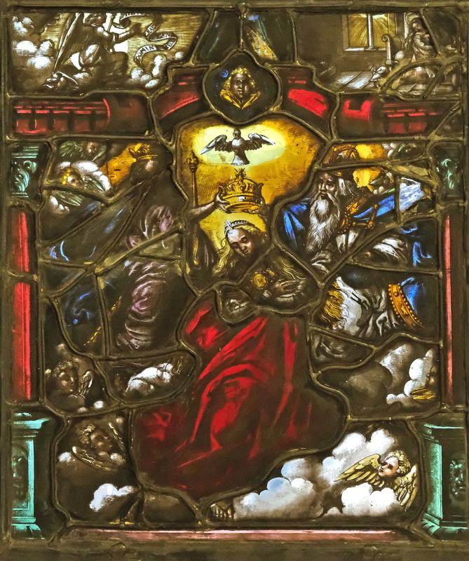In the center, the Virgin is crowned by the Trinity: Father to right, Son to left, and Holy Spirit above. Both Father and Son hold the crown. The Son wears a regal crown, the Father an Imperial one as well as holding an orb in his left hand. The scene is framed by classical pilasters with red shafts and blue bases and capitals that support a red lintel with an arch in the center. The arch shows a seraph's head in the center. Above the lintel is the Annunciation, when the angel Gabriel comes to greet the Virgin with God's request that she become the mother of the Messiah (Luke 1: 26-38). Gabriel is on the left and on the right is the Virgin at prayer.