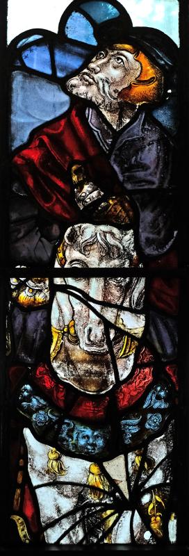 Red, violet, yellow, pot metal and uncolored glass with vitreous paint, silver stain, and sanguine.