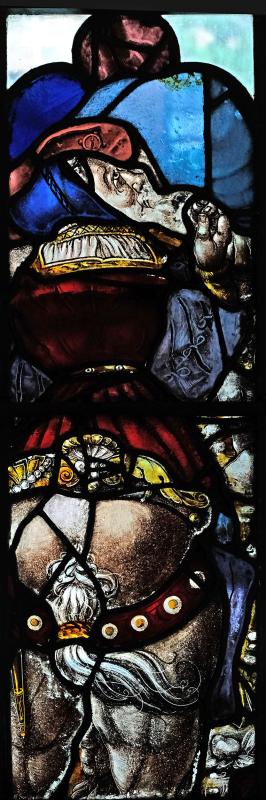 Red, violet, yellow, pot metal and uncolored glass with vitreous paint, silver stain, and sanguine.