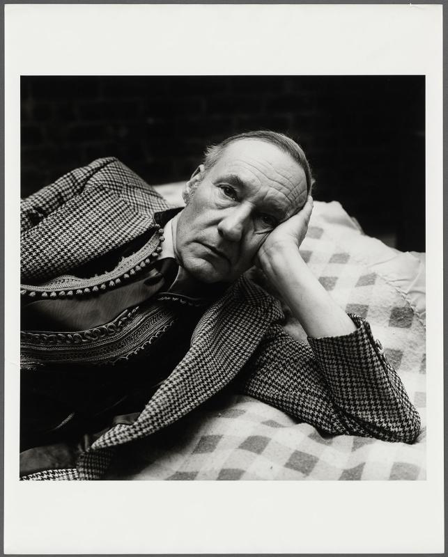 Half-length portrait of William Burroughs reclining, head resting on his left hand, facing front.