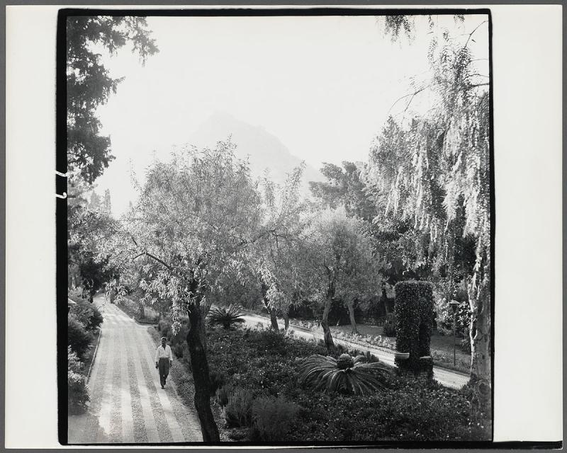 Landscape of a garden in Sicily. Two roads run parallel to eachother in the foreground, surrounded by trees and other flora. Joe Raffaelle walks towards the camera on the left road. In the background, mountains and clear skies.