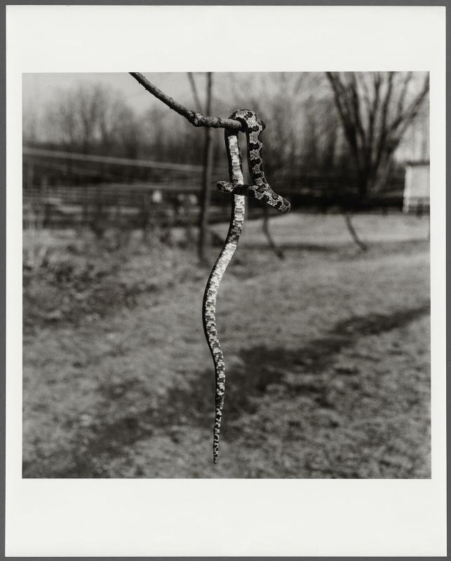 Verso: stamp, "The Estate of Peter Hujar, Stephen Koch Executor, Printed by the Artist"; stamp, "Copyright 1987, The Estate of Peter Hujar, Not to be Reproduced Without Written Permission from the Estate"; stamp, "From the Estate #" in pencil, "1067-12-2"; signed in pencil, "Stephen Koch"; in pencil, "EPH 1191-3"; in pencil, "Snake on a Branch, Baxter-Forman Farm, Germantown, N.Y. 1985"; in pencil, "HUJ 048".