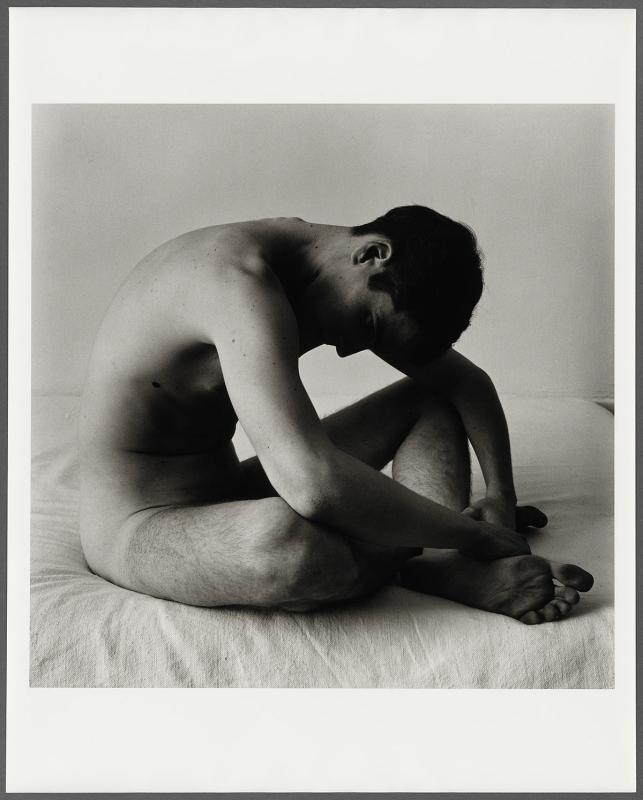 Full-length nude portrait of a man sitting cross-legged, facing three-quarters to the right, looking down. Taken in Hujar's studio.