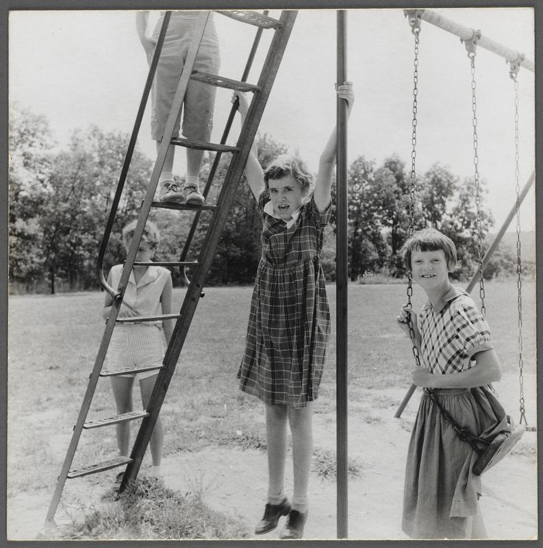 Verso: stamp, "The Estate of Peter Hujar, Stephen Koch Executor, Printed by the Artist"; stamp, "Copyright 19_ _, The Estate of Peter Hujar, Not to be Reproduced Without Written Permission from the Estate"; stamp, "From the Estate #" in pencil, "197-5-63"; signed in pencil, "Stephen Koch"; in pencil, "EPH 1443-1"; in pencil, "Girl Hanging on Slide, Southbury, CT. 1957"; in pencil, "HUJ 157".