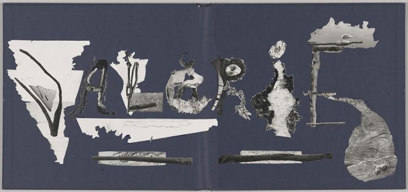 Fragments of photographs cut from John Gossage book and arranged to spell the name "Valerie".