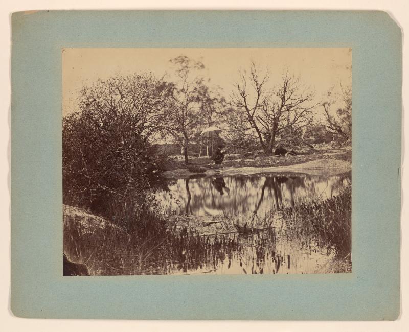 Reflected in the pond is an artist with a portable setup, which includes a parasol to shield him and his work surface from the sunʼs harshest glares. As in many artistsʼ views of the forest, a companion is seen nearby, here lounging beneath a bare tree. Artists often ventured into the woods together, and many whose works are exhibited in this gallery forged strong friendships with each other on these excursions.