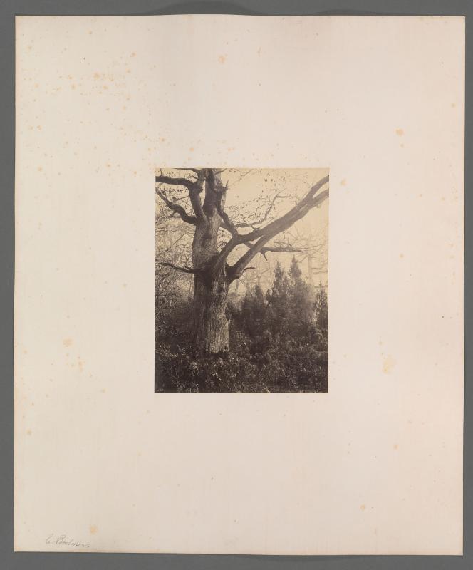 Eugène Cuvelier learned photography from his father, Adalbert, and continued his fatherʼs friendships with Corot and other Barbizon artists. Eugène was an amateur photographer, unpressured by commissions, and even as professional makers of “views” adopted the fact-dense glass-plate negative in the 1850s and 1860s, he remained true to the paper negative process he had learned from his father. The technique lends his exposures a brushy texture reminiscent of charcoal or graphite drawings, which suited his preference for depicting Fontainebleauʼs wildest, most intimate spots.