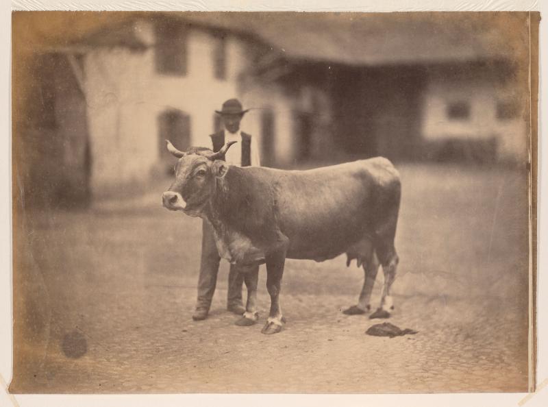 The artistʼs enterprising studio, Braun et Cie, used new modes of photographic reproduction to reach a wide market. He even made photographs of paintings and sculptures in French collections for use by art history professors in the United States. This rare albumen print by Braun, whose livestock studies are more often carbon prints, exemplifies the effect of using a large aperture to achieve differential focus: the cow is sharply defined while everything else is blurred.