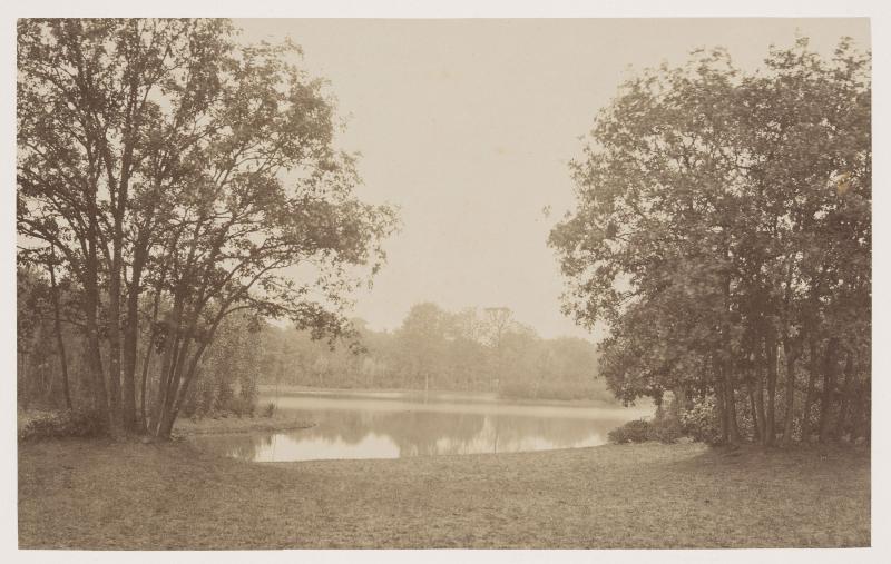 Born Charles François Bossu, Marville was a successful illustrator and painter before he took up photography in 1850. By 1862 he was an official photographer for the city of Paris, where he chronicled Baron Georges-Eugène Haussmannʼs campaign to modernize the cityʼs infrastructure and architecture under the direction of Napoleon III. Inspired by Londonʼs Hyde Park, Napoleon established the sprawling Bois de Boulogne in 1852 as an urban sanctuary for all classes. He demanded that the new park have lakes and streams “to give life to this arid promenade” and to bring closer to home some of the peace found in the forest of Fontainebleau.