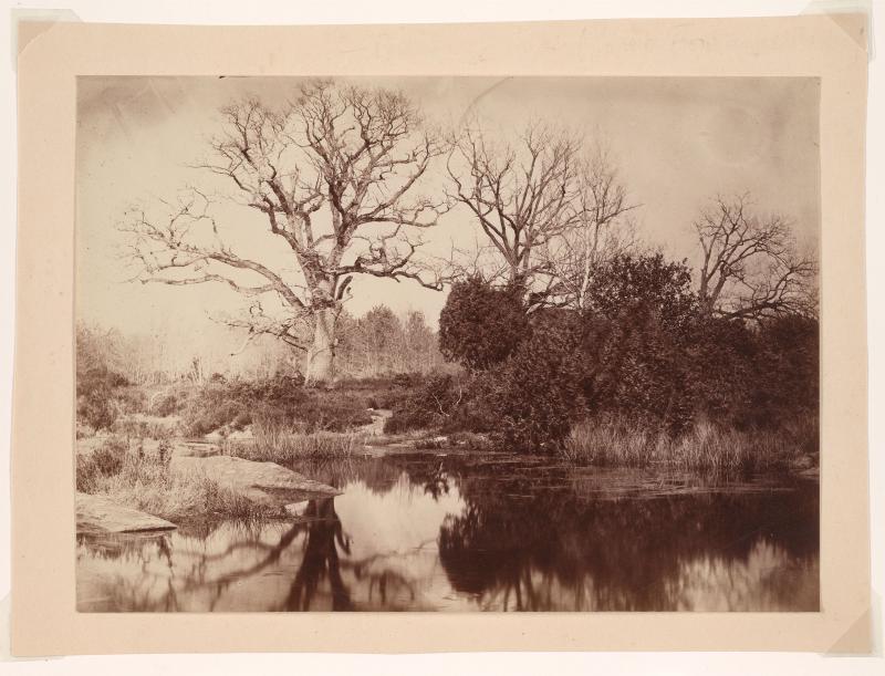 With an eye for arresting detail and compelling composition, Famin photographed rural life in and around Fontainebleau and sold his prints of animals and laborers to painters as visual aids. The Mare aux Fées became a landmark for navigating the dense woods as well as a gathering spot for artists. In fact, Faminʼs image features the painter Théophile Chauvel standing across the pond.