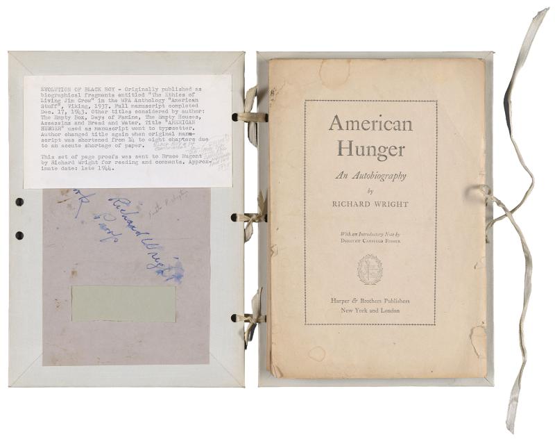 Inscription in unknown hand in graphite on front wrapper: American Hunger by Richard Wright; inscription in unknown hand in ink on half title page: (Sophie: this is Proof Copy, different in important respects from the book as it will be published, Keep it confidential [underlined] -- C.M.); inscription in unknown hand in graphite on typed reminder affixed to half title page: BLACK BOY; inscription in unknown hand in graphite on title page: Prob. Aug. 23, Prob. $2.75.
