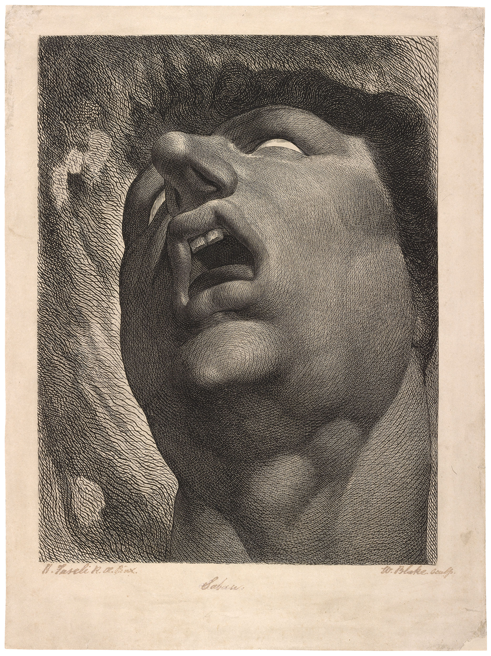 Inscribed at lower right, in pen and black ink, H. Fuseli R. A. Pi Satan, W. Blake sculp.