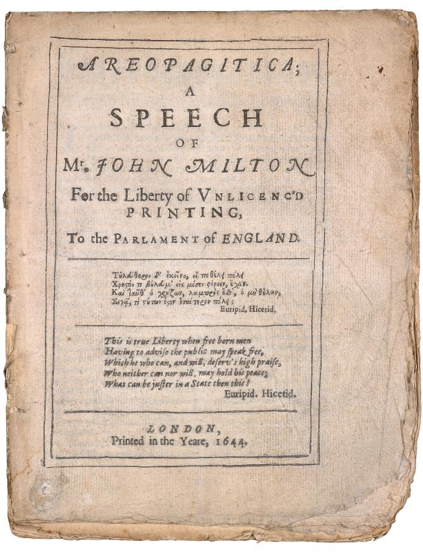First ed., second state, according to Complete prose works of John Milton, New Haven, 1959, v. 2, p. 480-483. The largest copy known.