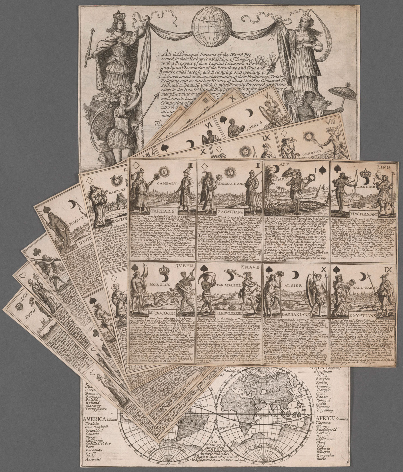 Introductory sheet signed "H. Winstanley at Littlebury fecit" and 7 sheets showing cards for 4 suits: hearts - Europe, diamonds - Asia, spades - Africa, clubs- America.