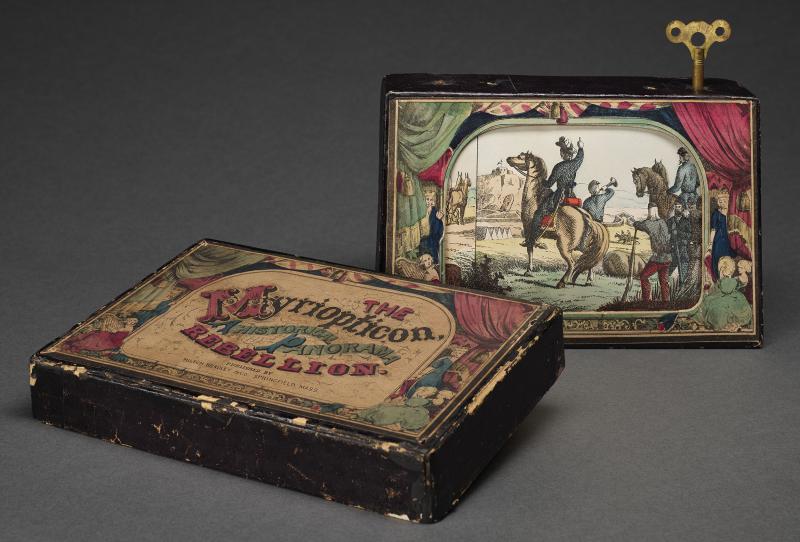Milton Bradley, a Springfield, Mass. draftsman, printmaker and designer, created the Myriopticon in 1866. Although it did not appear until after the war was over, the Myriopticon was part of the integration of childhood and war. The pictures were intended to be back-lit by a lantern or candle and shown in a darkened room (Marten)